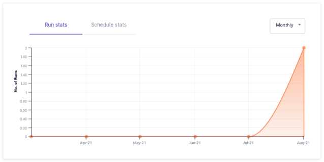 In first tab, you can compare number of chaos scenario runs according to selected granuality i.e. Daily/Monthly/Hourly. Granuality can be changed using drop-down in top right corner.